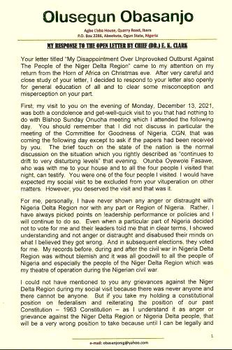 Clark, the leader of the Pan Niger Delta Forum, PANDEF, and Chairman of the Board of Trustees, Ijaw National Congress, INC, had sent an open letter to Obasanjo.