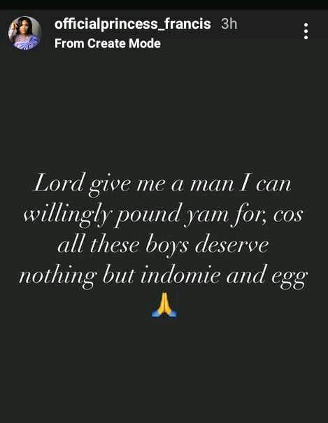 Lord Give Me A Man I Can Willingly Pound Yam For – BBNaija’s Princess Prays
