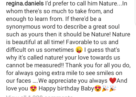 Describing him as nature, she said her husband, Ned Nwoko, was one from whom so much could be gotten. She said he was a beautiful soul and appreciated him for all he did for the family. Then she ended with saying, “I love you baby”.