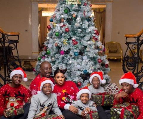 Dressed in Christmas attires, the couple and their five sons posed in front of a Christmas tree.